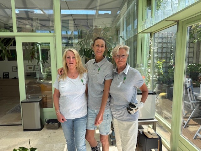 Deze drie gratiën met hun ‘bedrijfskleding’ werkten vanochtend weer hard ondanks de felle windstoten. Afknippen van de bloeiende aren van de ridderzuring was hun voornaamste werk vandaag.